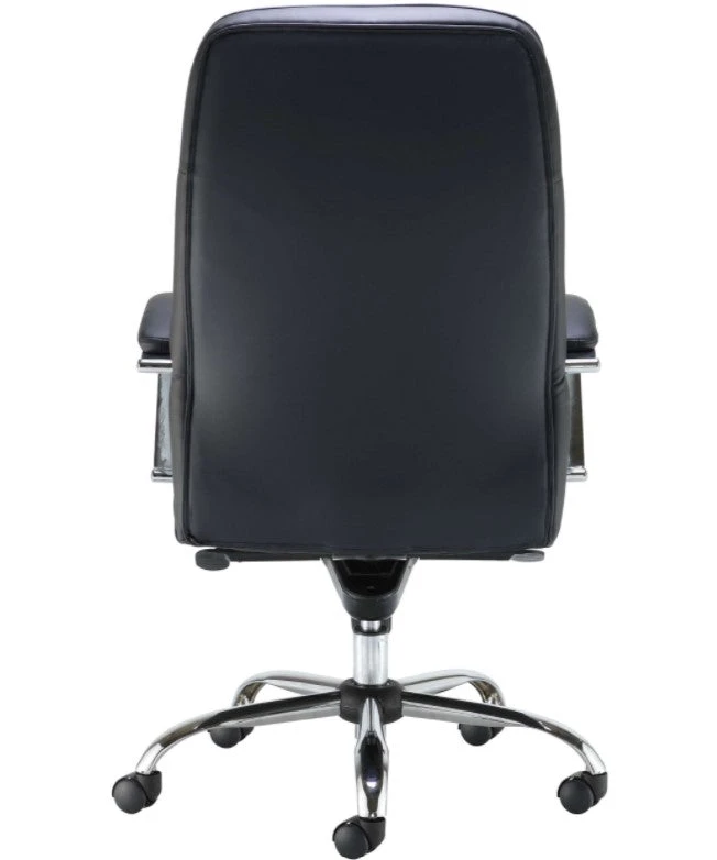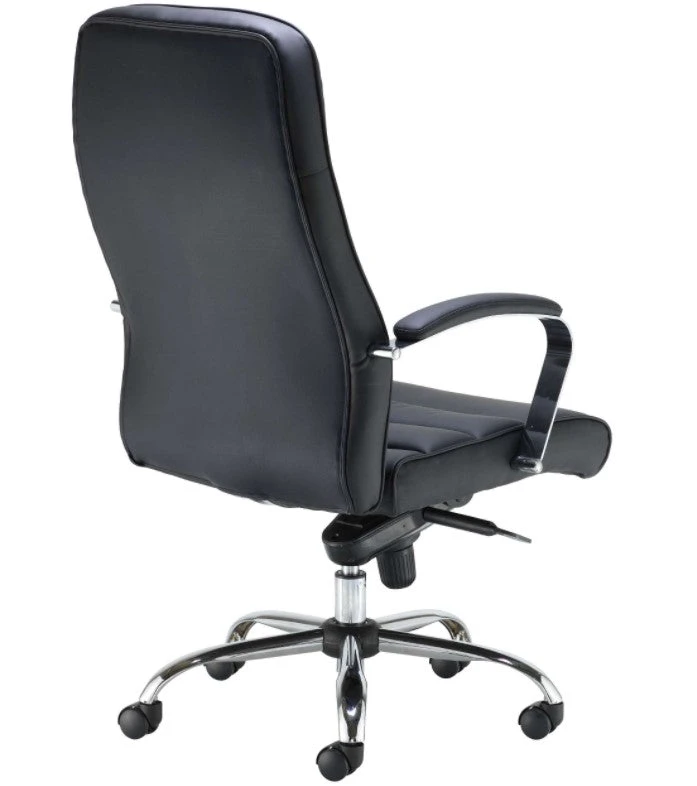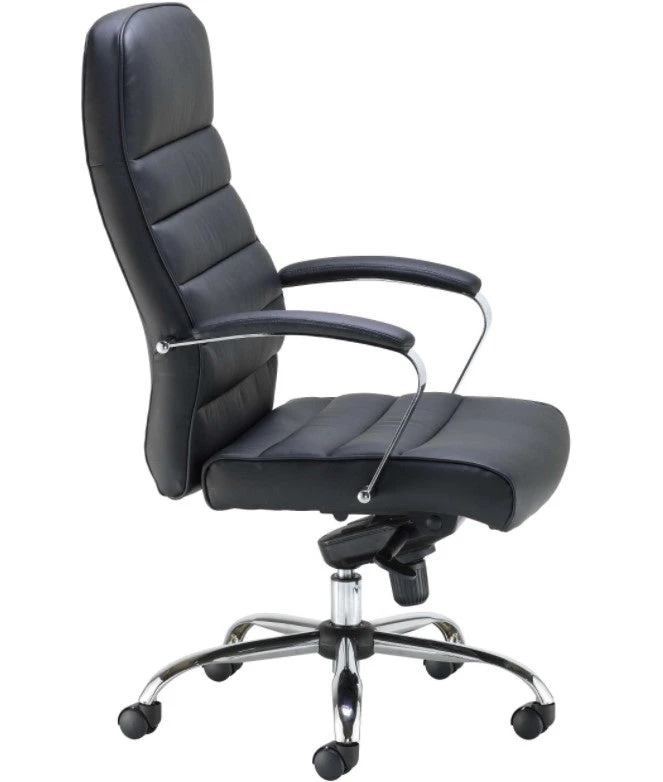 A luxurious executive leather look office chair with padded arm rests as well as a stylish chrome base. Knee tilt mechanism to suit your needs.Â