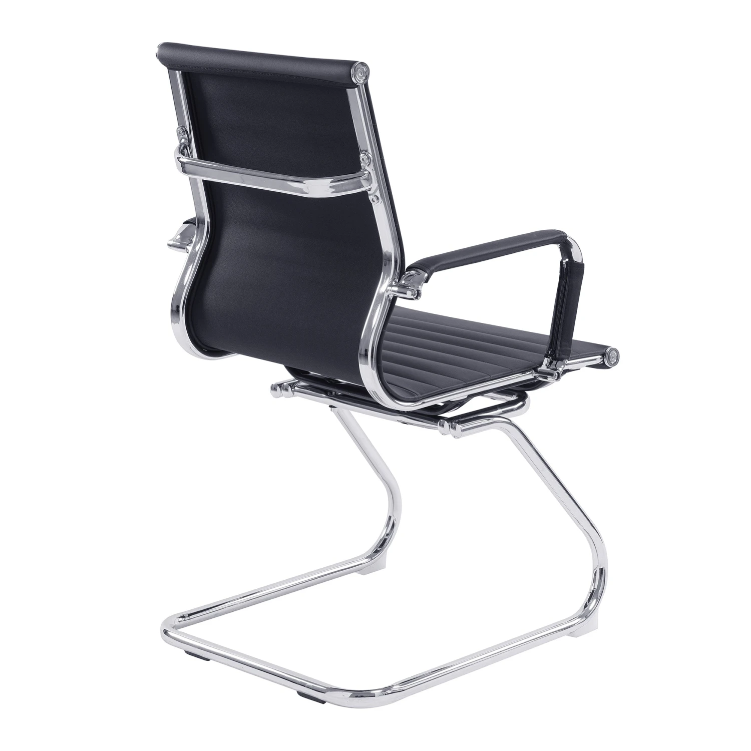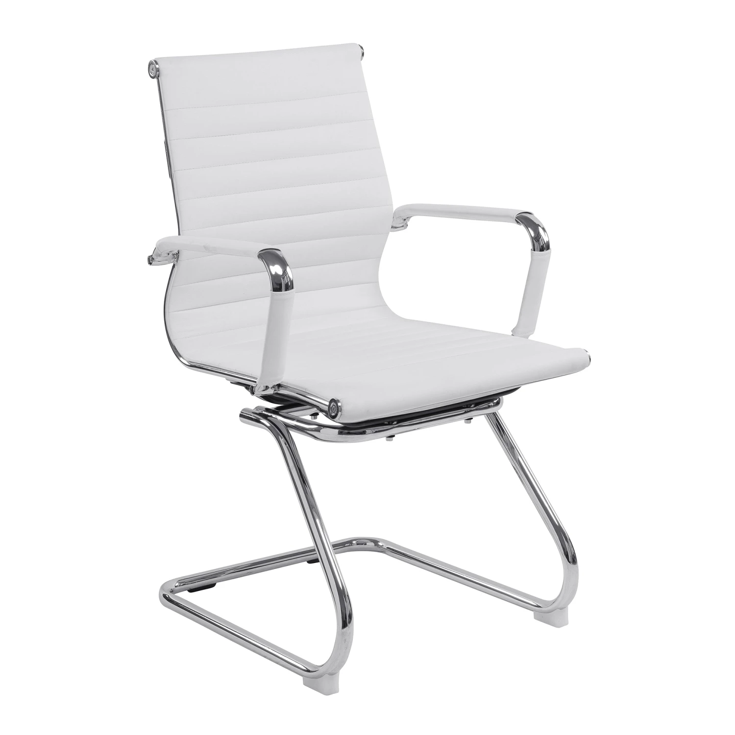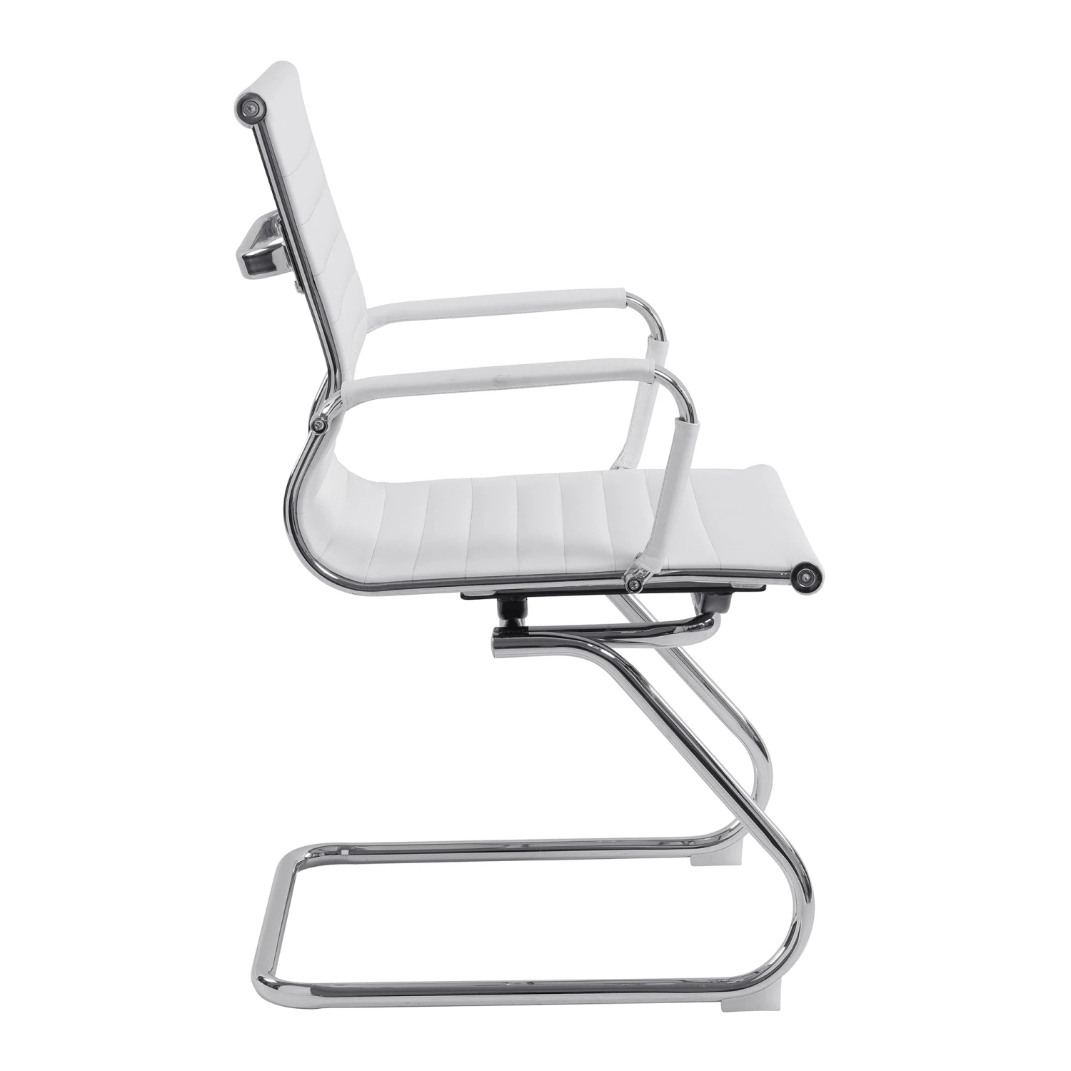 This design classic office meeting chair is available from stock in black or white contemporary leather style finish with a stylish polished chrome cantilever base suitable for waiting rooms and receptions. The medium back providing back and lumbar support.