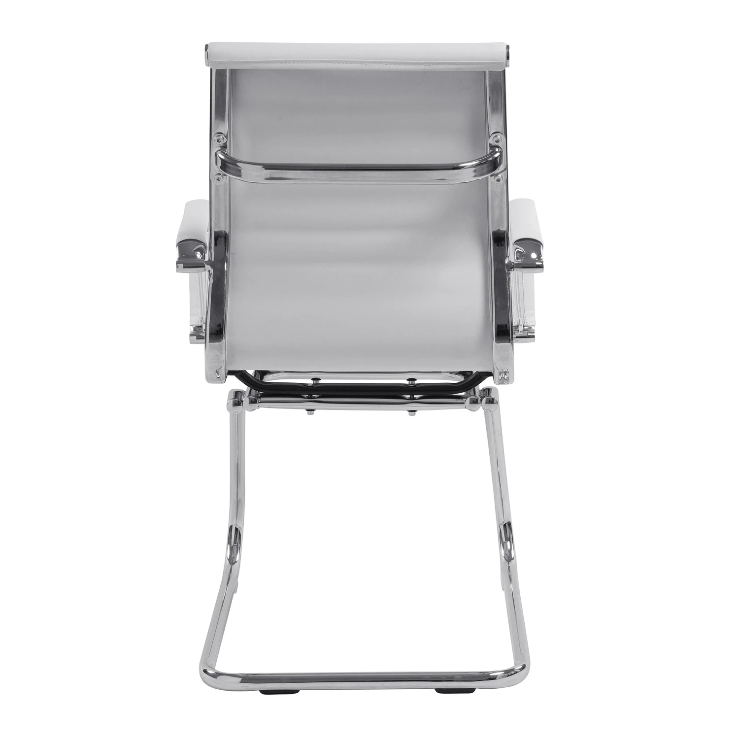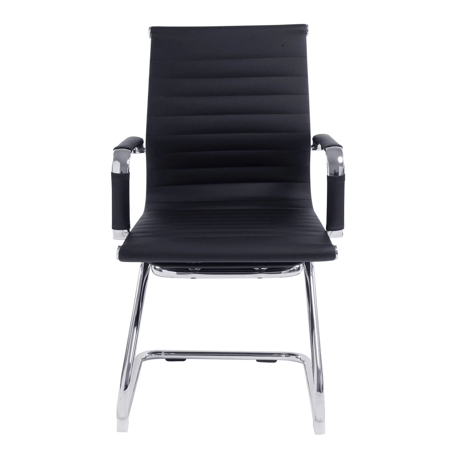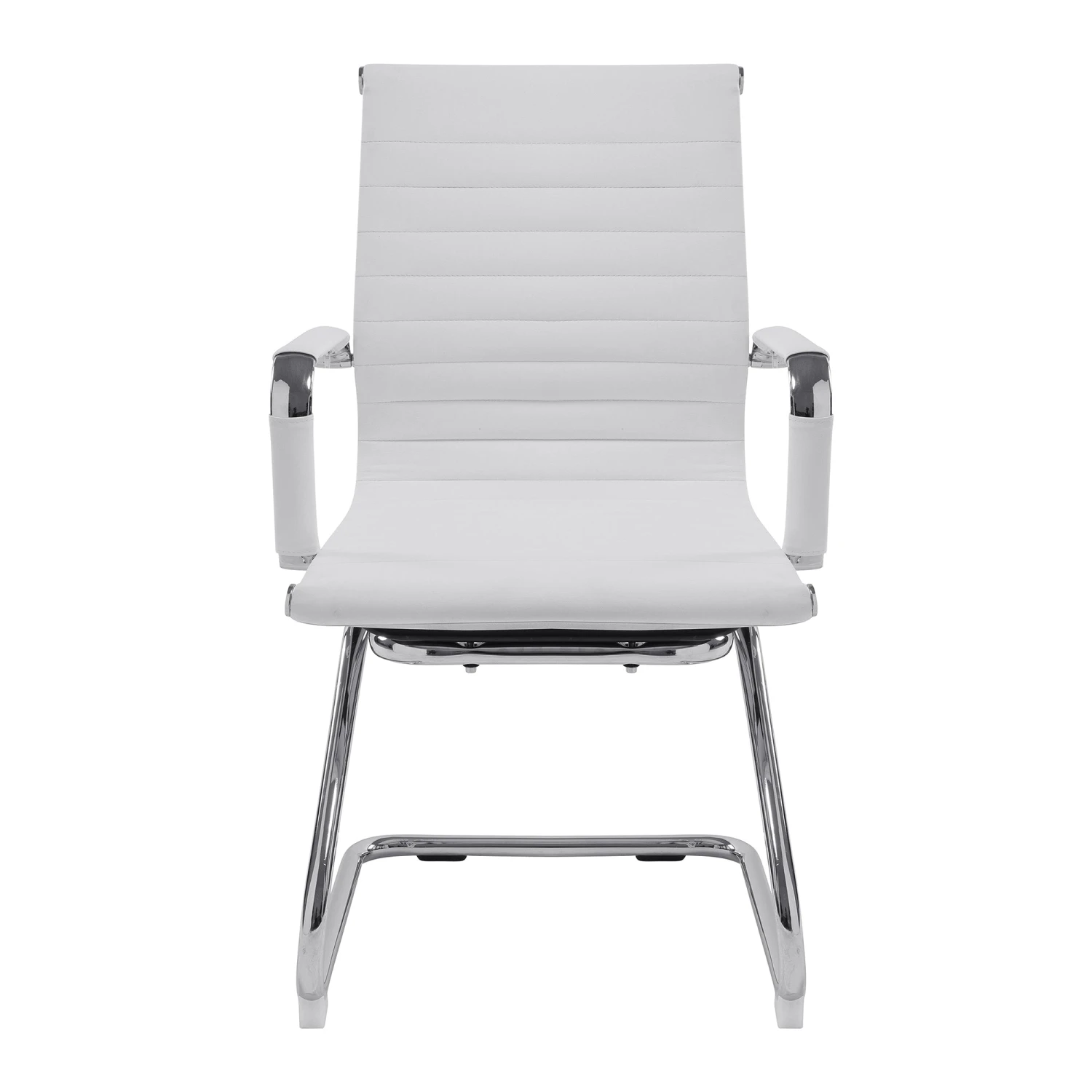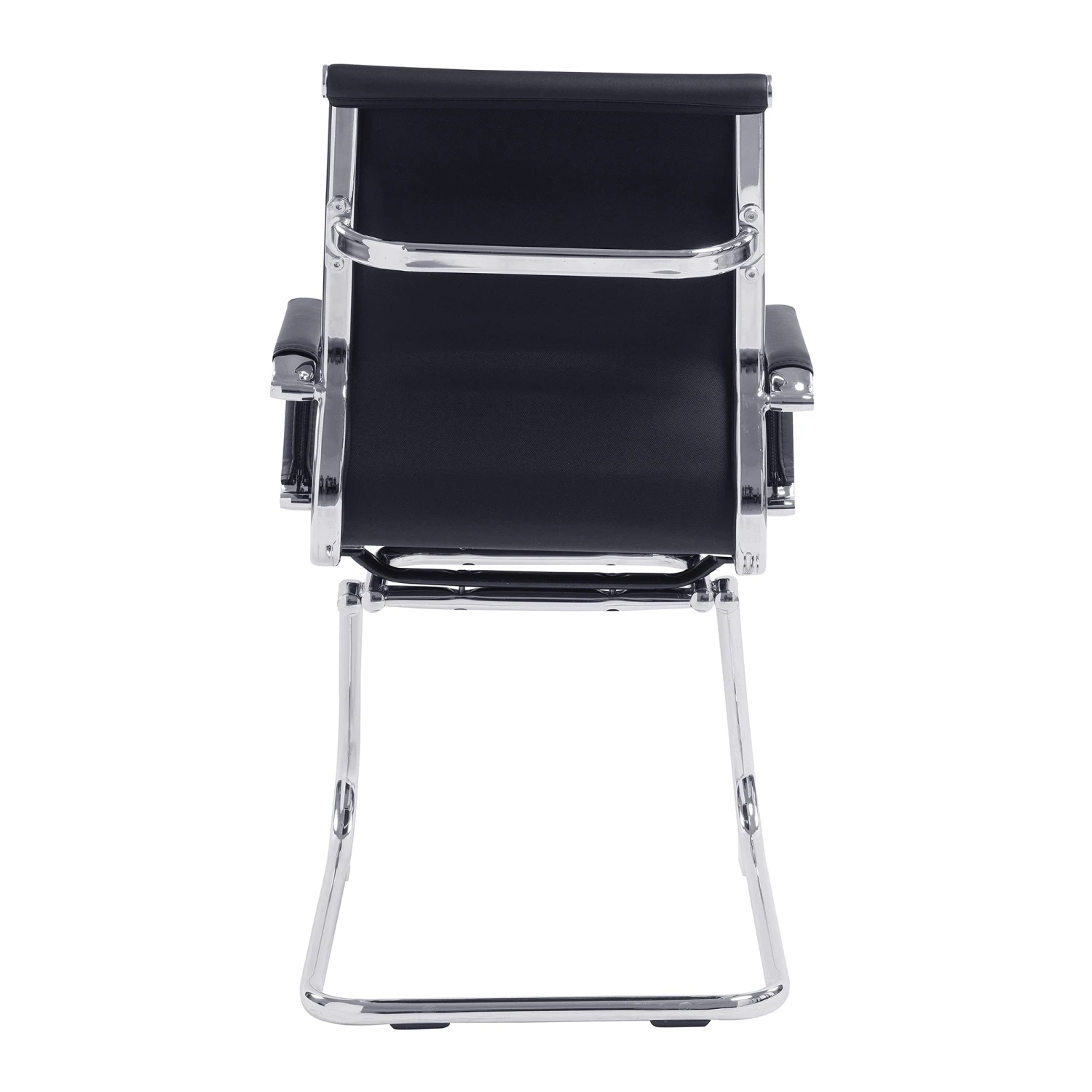 This design classic office meeting chair is available from stock in black or white contemporary leather style finish with a stylish polished chrome cantilever base suitable for waiting rooms and receptions. The medium back providing back and lumbar support.