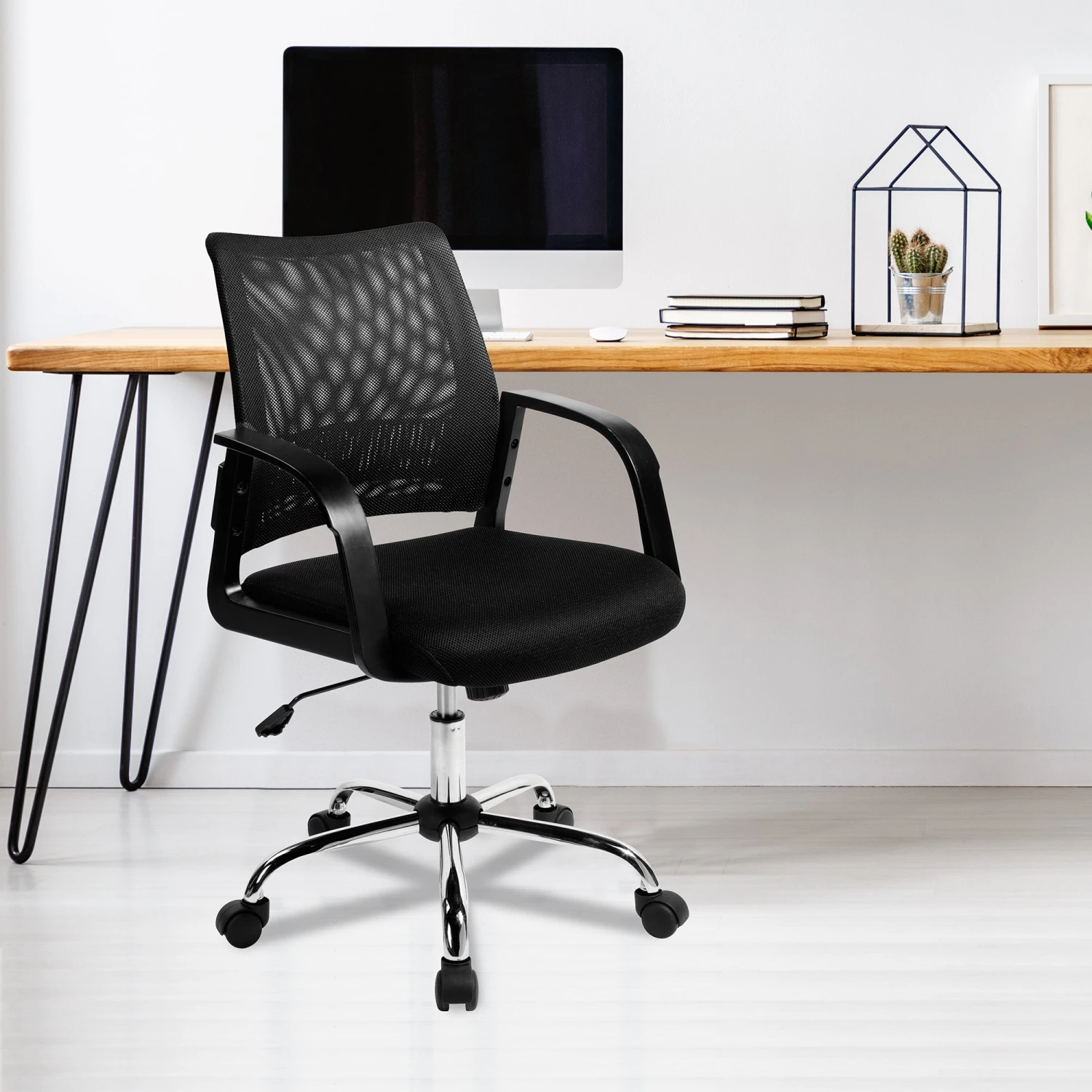 Medium mesh back task operator armchair with chrome base. Mid back posture contoured AIRFLOW mesh detailed backrest Upholstered black fabric seat with waterfall front. Fixed stylish heavy duty arms Adjustable height and angle.