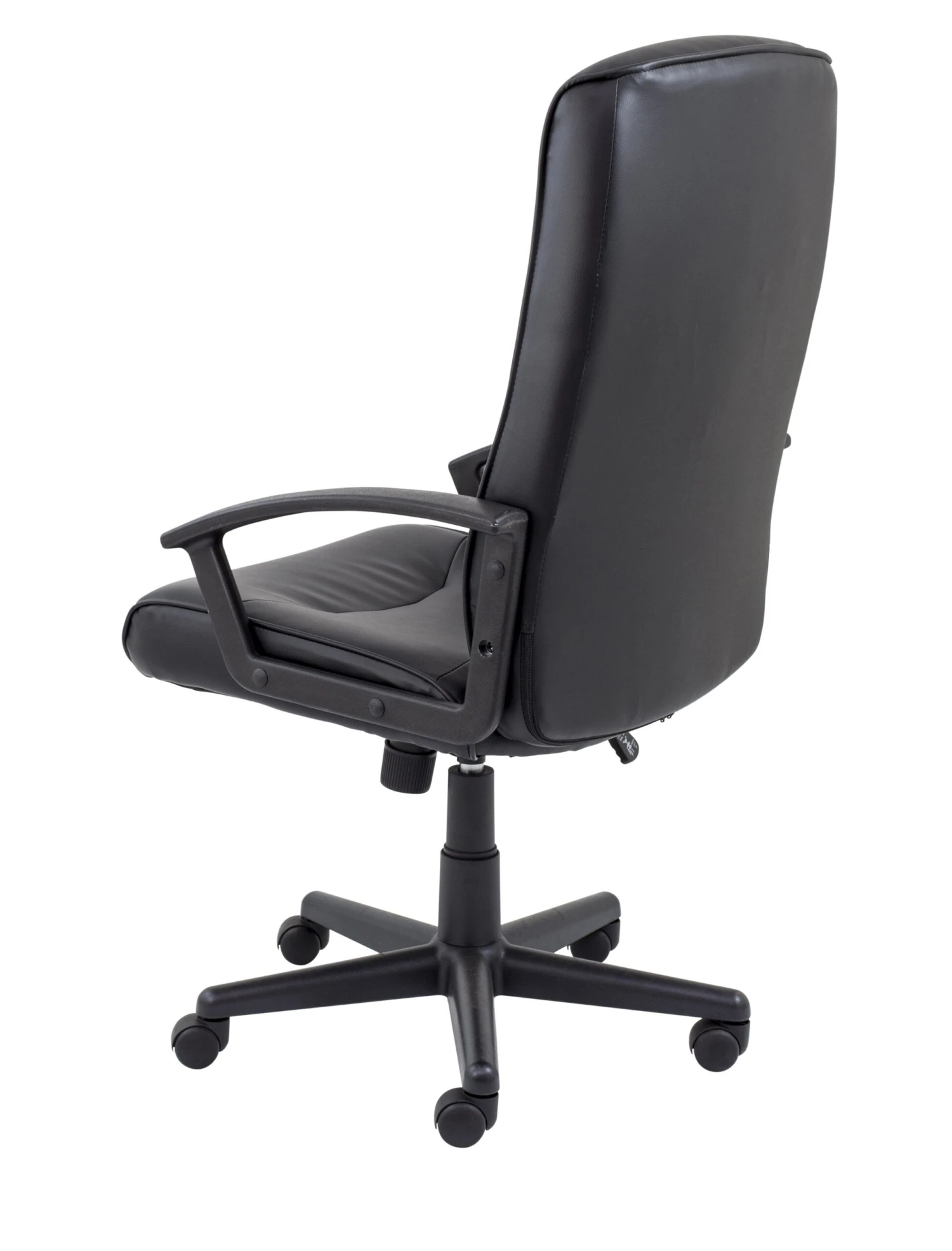 - High back leather-look or fabric executive office chair with a swivel base and fixed arms