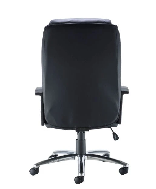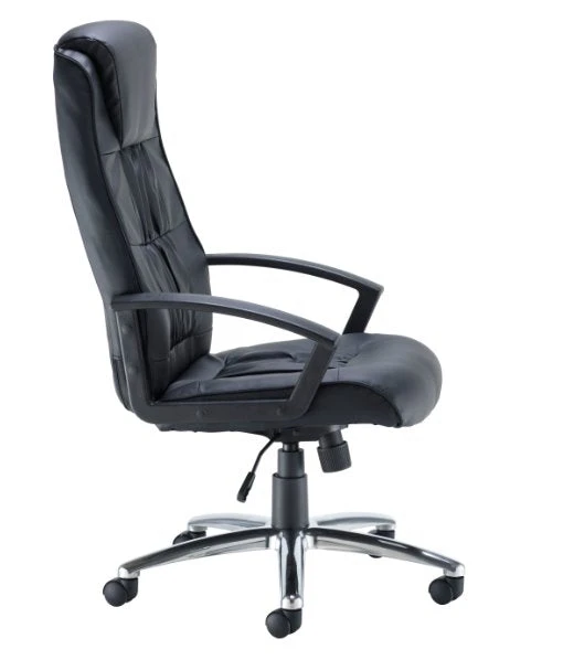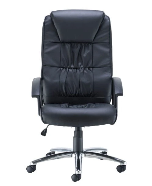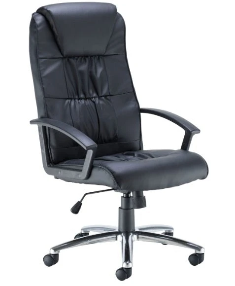 - High back leather-look executive office chair with a swivel base and fixed arms