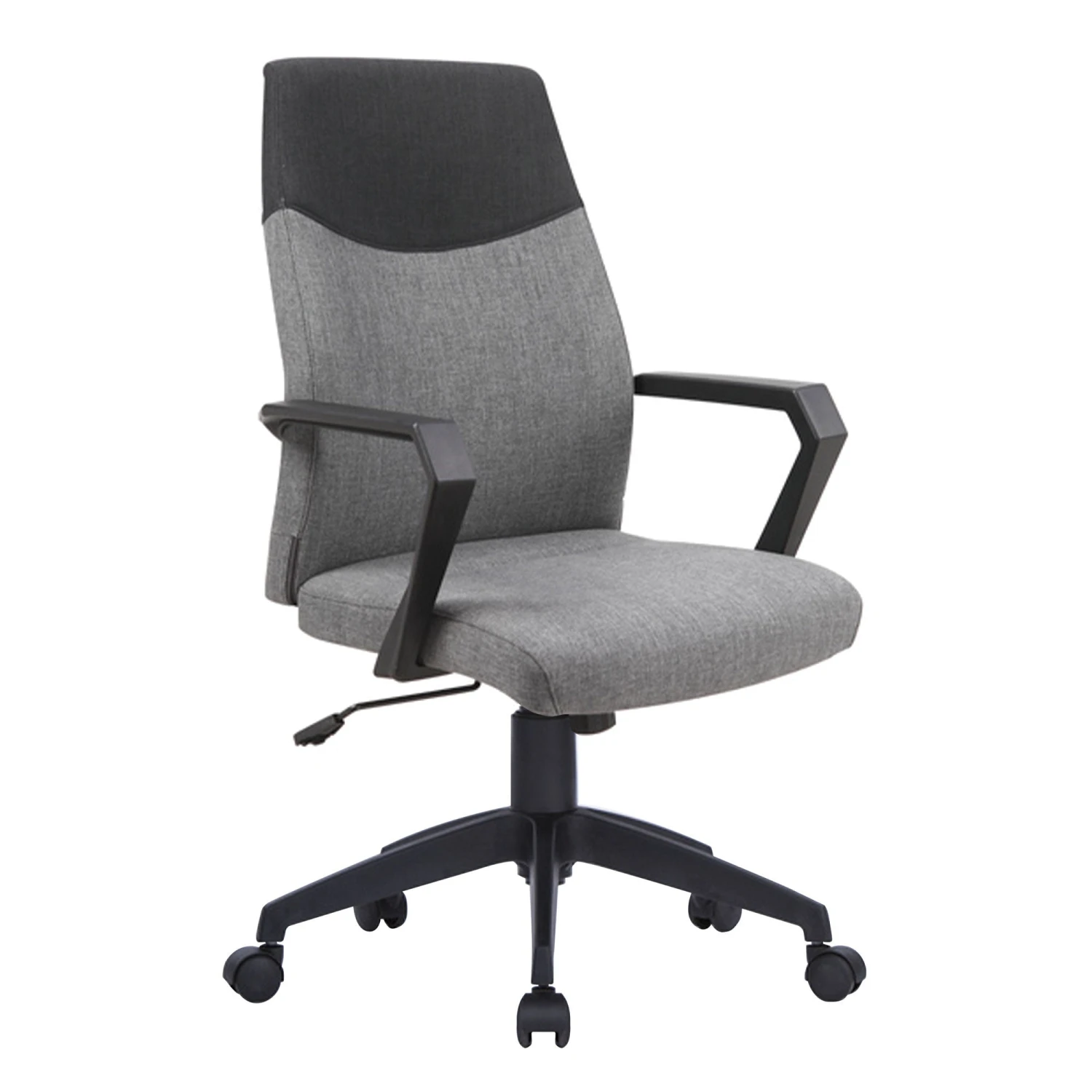 Enhance your office environment with this modern high-back executive chair, designed for both durability and style, which together boost your productivity and comfort. This armchair boasts durable fabric upholstery and a sleek two-tone back with angular arms, giving it a contemporary edge. It skilfully merges function and comfort with modern design. Equipped with a 360-degree swivel, an adjustable gas lift for seat height customisation, heavy-duty nylon castors, and a powder-coated nylon black base, this chair ensures smooth movement and reliable stability. Experience the ideal combination of form and function with this executive chair. Â