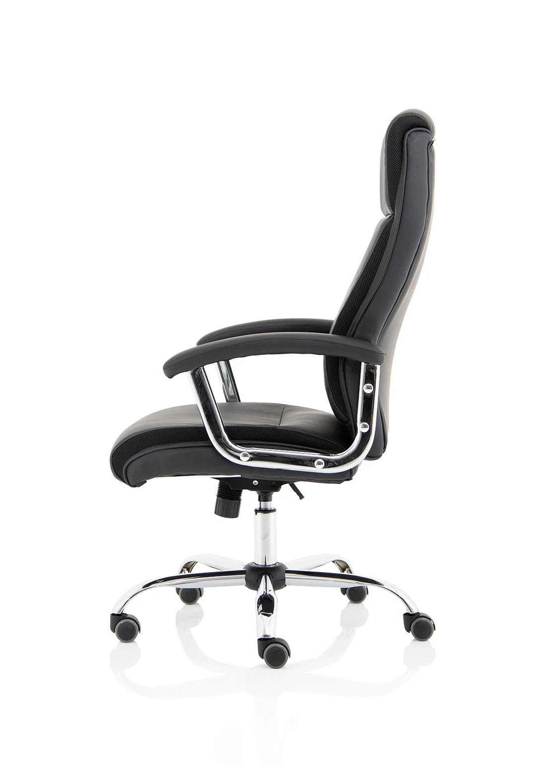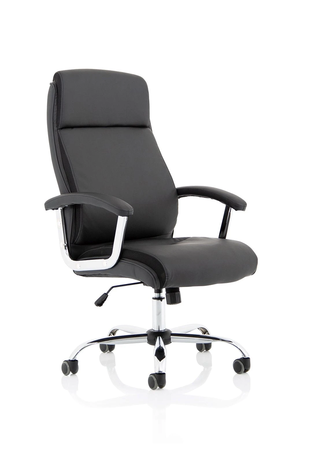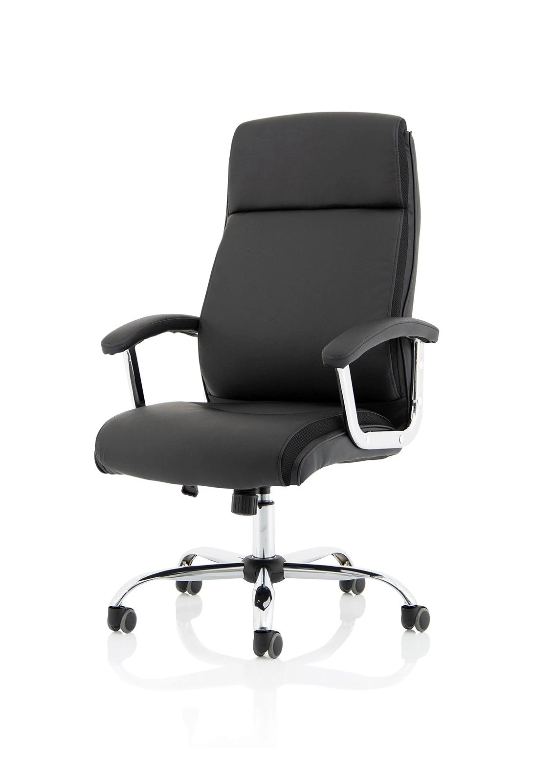 b” Soft touch leather upholstery b” Distinct padded chrome armrests with matching wheelbase b” Clean and stylish stitch detailing b” Single lever tilt and lock mechanism b” Waterfall seat