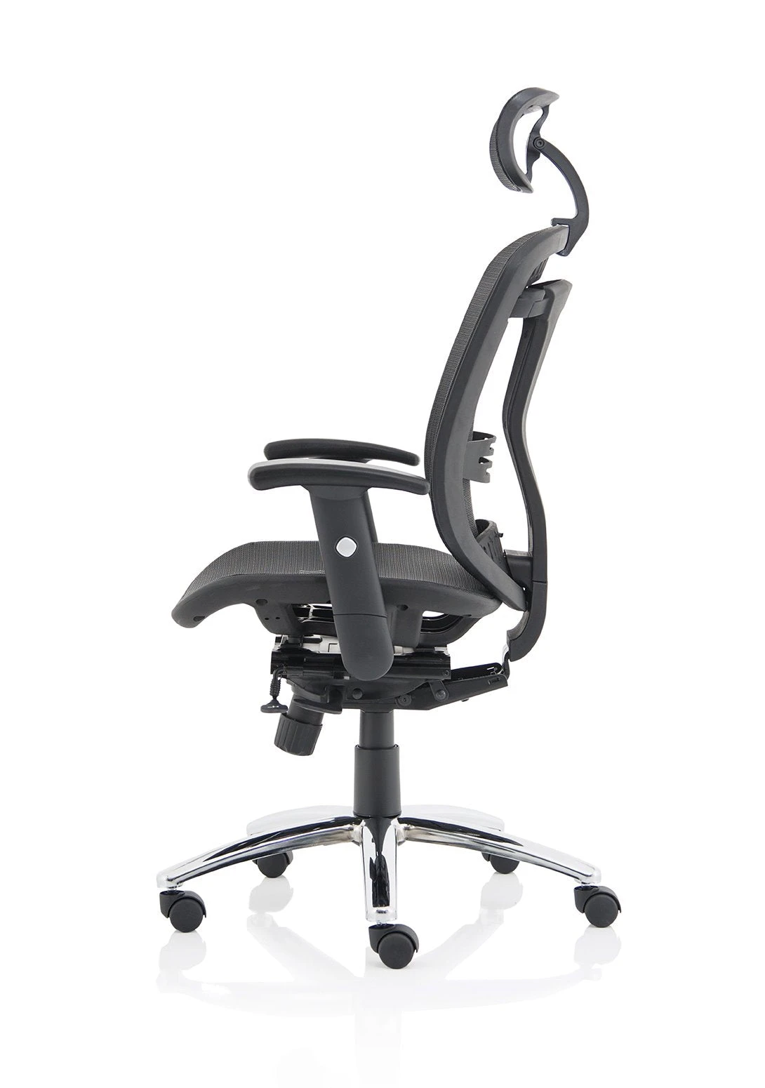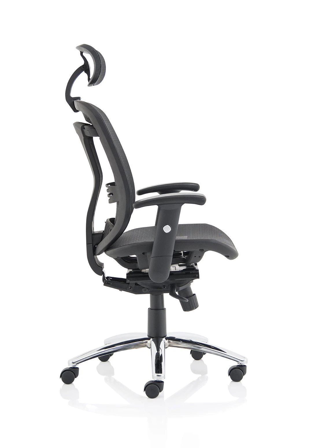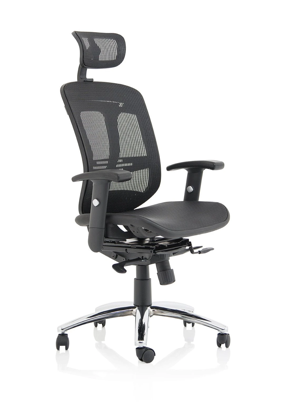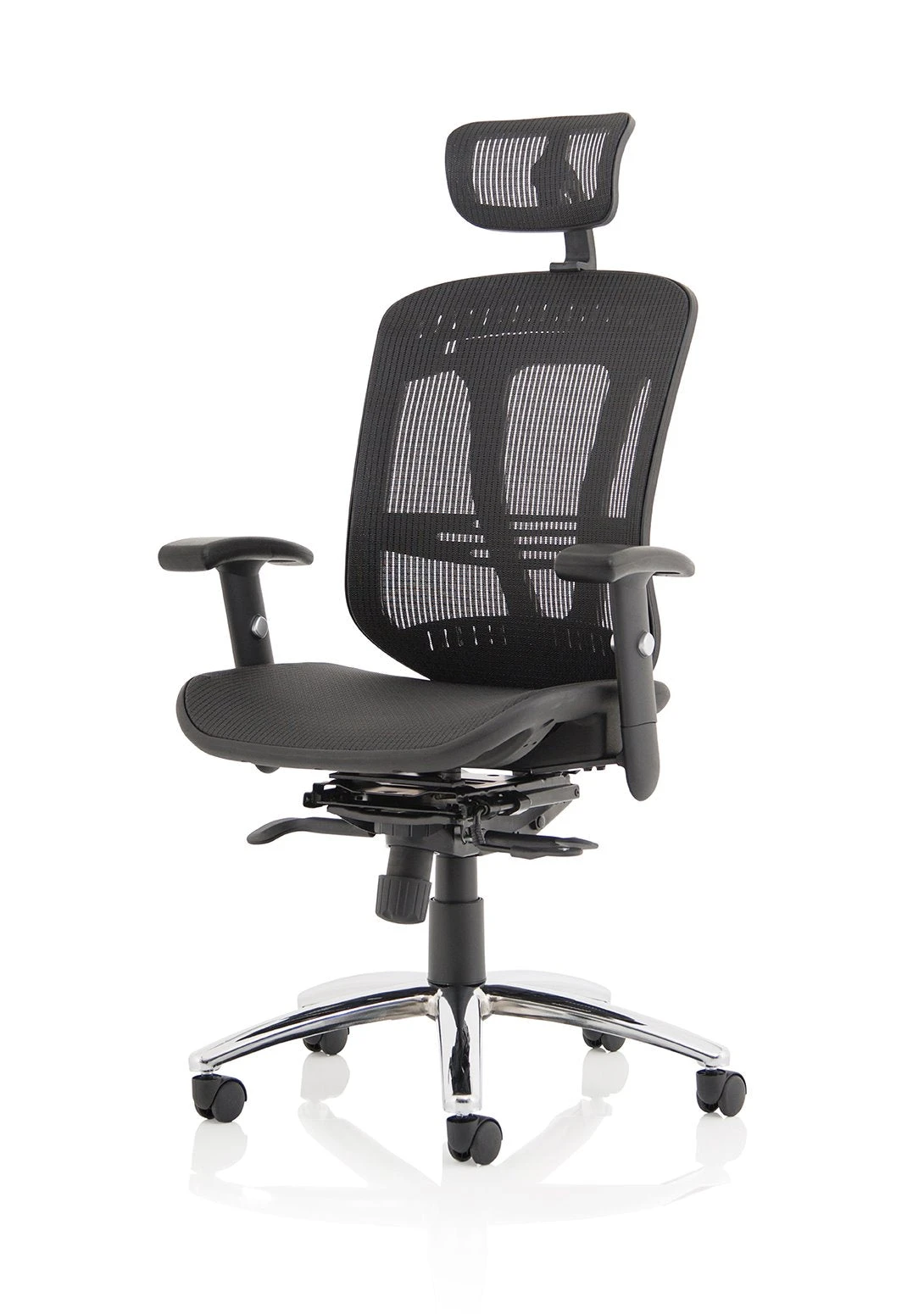 b Comfortable sprung mesh back and seat b” Adjustable arms as standard b” Infinite lock mechanism b” Lumbar support b” Adjustable headrest b” Seat slide b” Headrest