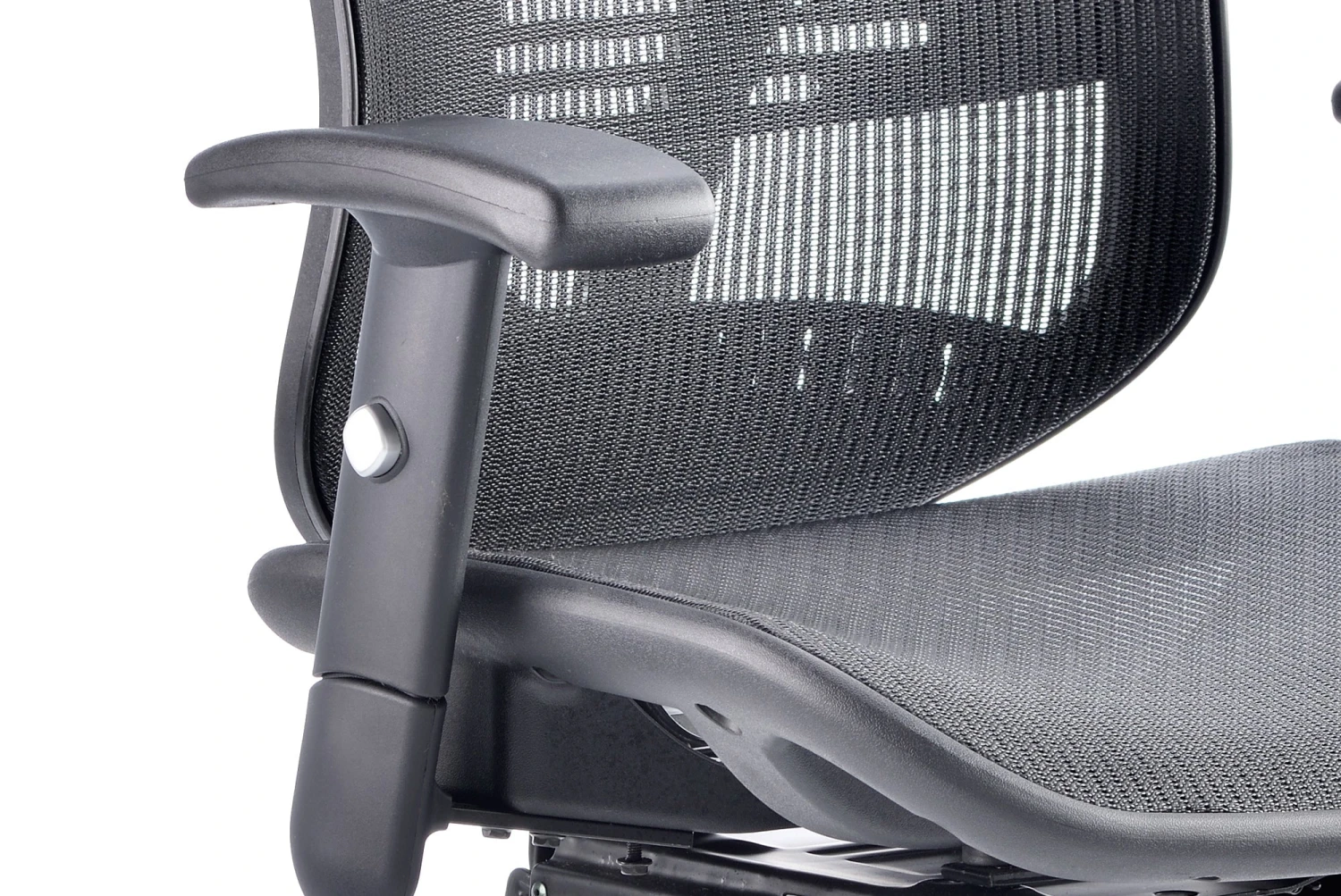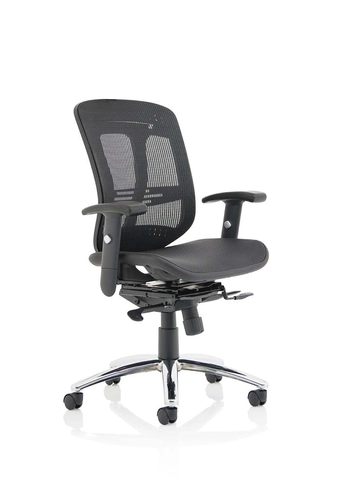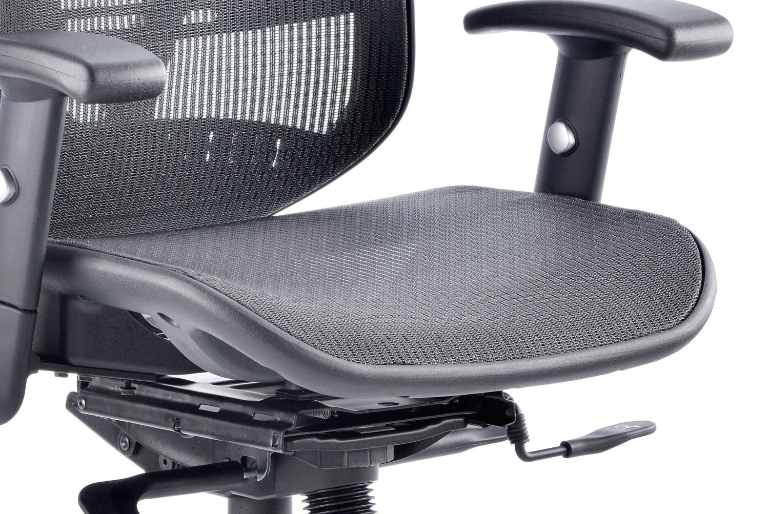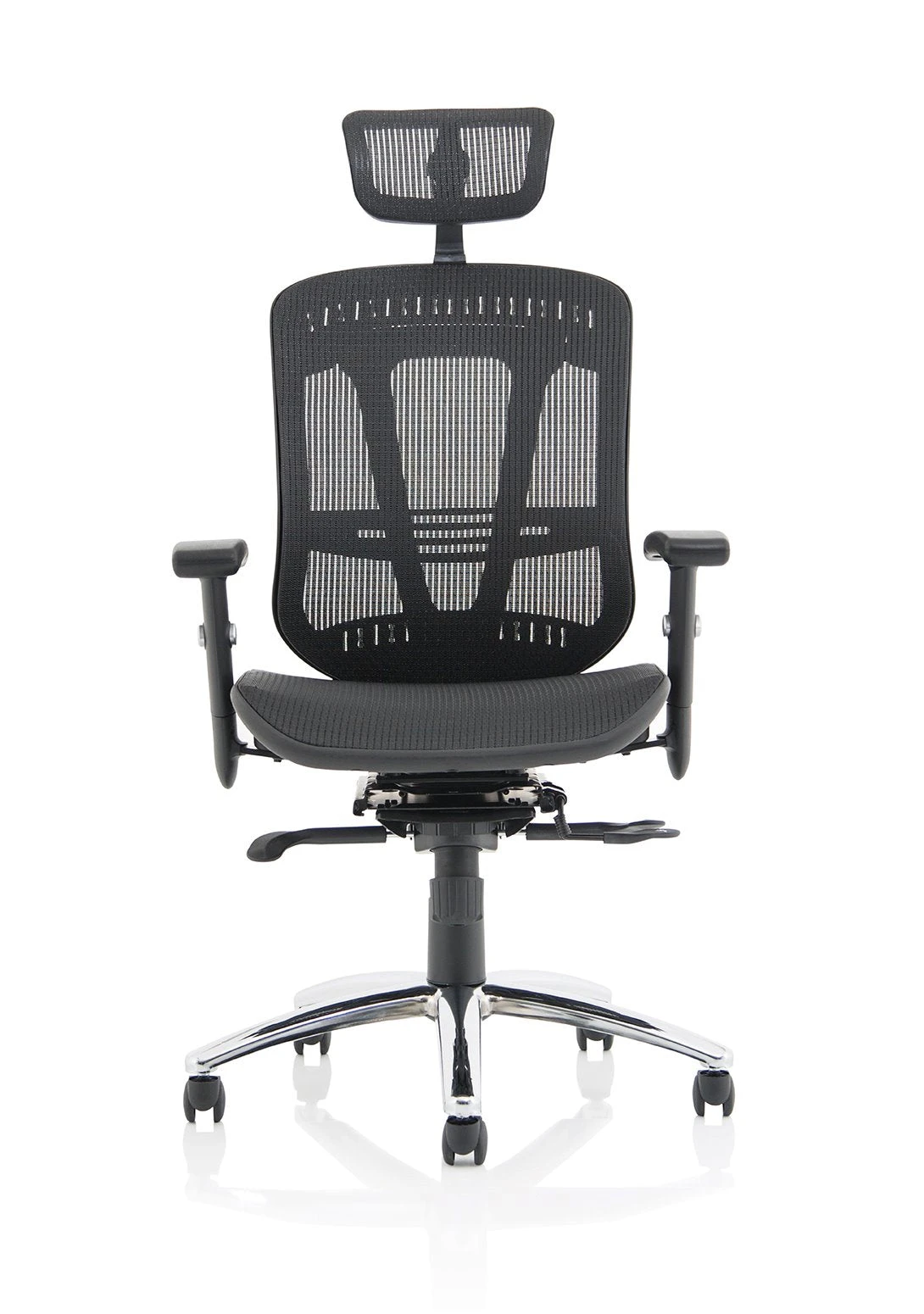 b Comfortable sprung mesh back and seat b” Adjustable arms as standard b” Infinite lock mechanism b” Lumbar support b” Adjustable headrest b” Seat slide b” Headrest