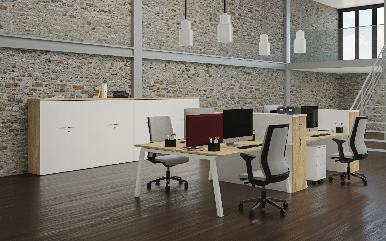 This great value office bench desk range comes in a range of top finishes and either white, black or aluminium finish leg frames.Â